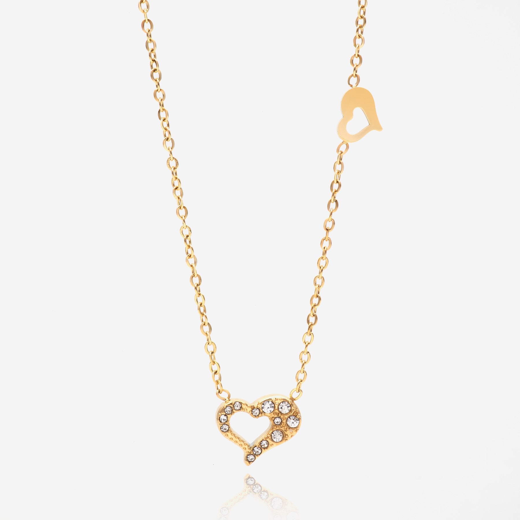 Show your love with the Ilana Necklace. Studded with rhinestones and plated in high quality PVD 18K gold, this necklace is both beautiful and durable. The advanced tarnish resistant coating ensures it will dazzle for years to come. Perfect for any day of the week, this elegant piece features two hearts, symbolizing two people in love.
